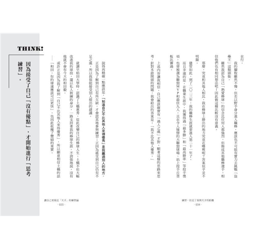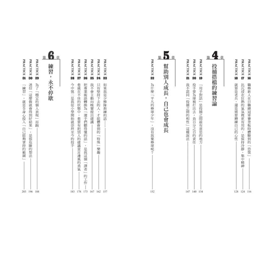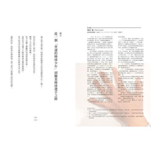 除了講述棒球經歷之外,更多篇幅著墨於描寫思考如何提升專業技能,事業遇到挫折時該如何自處與克服,以及運動選手的人文關懷、回饋社會、培育業界人才等。不但能一窺當代名投的成長經歷和許多日本職棒內的故事,還能和臺灣當前的棒球環境做比較,看看臺、日棒球文化的差異有哪些,什麼地方可以做為借鑑與學習,享受到「看門道」的樂趣。