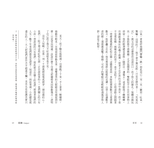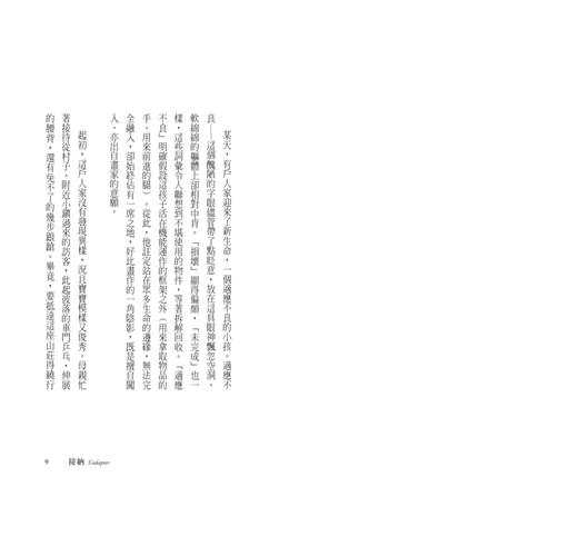 這是誕生在這個家的第三個孩子。褐髮、白白胖胖,大大的眼睛眨呀眨,在備受期待與關愛的環境下降臨這世界。但是,隨著年歲成長,他的眼神似乎異常空洞,飄忽而不聚焦;他會笑、會皺眉,四肢卻癱瘓不受控制;嘴巴咿咿嗚嗚,只能發出有限的聲響。他──這個孩子──不是個「正常」的孩子。