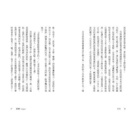 老么,在孩子過世後誕生的小孩。為什麼哥哥不親近他?若是「孩子」沒有死,他還會出生嗎?他背負著修復這個家的使命,努力做個乖小孩,卻發現「孩子」從未在家中所有人的心中淡去……