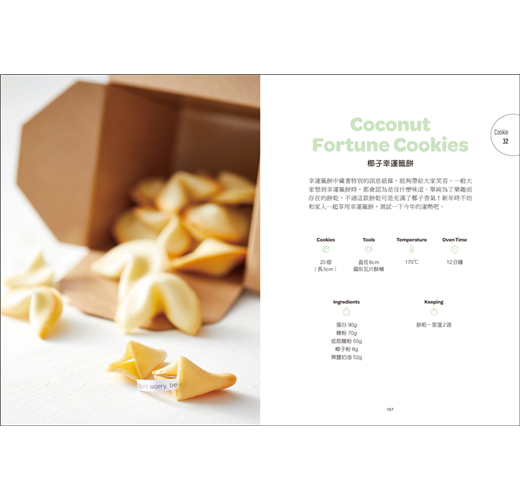 「這是一本實用的餅乾食譜書,非常適合咖啡館、糕點店、自宅伴手禮準備。作者多恩在每道食譜中詳細的介紹溫度、器具、烘焙時間及產品數量,對於新手烘焙者來說是一大福音。同時還大方分享如何製作 L'ecole Caku 最受歡迎的曲奇餅乾,即使不用出國也能享受韓國熱門點心。 每道食譜還包括儲存建議和一些技巧。這是一本讓您製作出完美程度高的餅乾食譜書。」