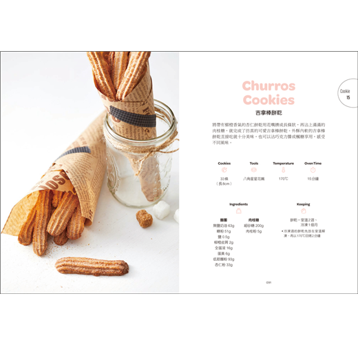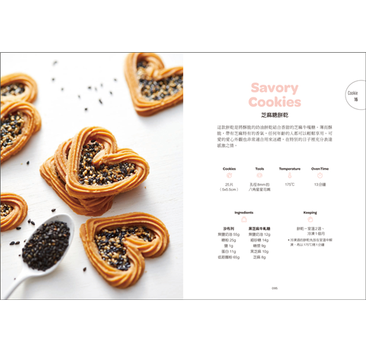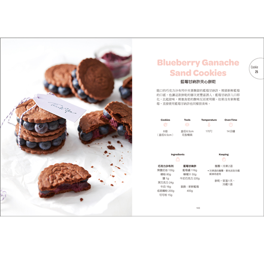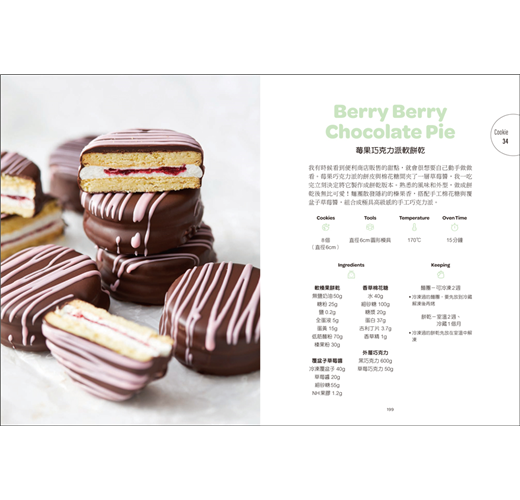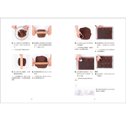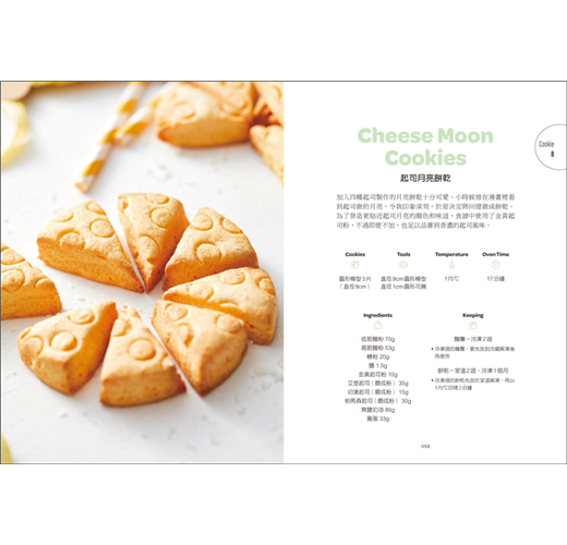 全書以造型方式分類,包含「手壓揉圓」巧克力軟餅乾、「刀切塑形」起司月亮餅乾、「擠花造型」馬鈴薯奶油圈餅,還有「裹粉」的黑芝麻雪球、「夾餡」覆盆子果醬餅乾、「模具造型」的栗子餅乾。善用各種造型方式,做出可愛吸睛的高級質感!