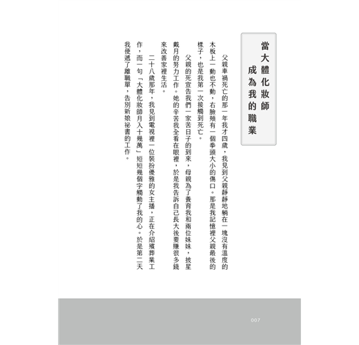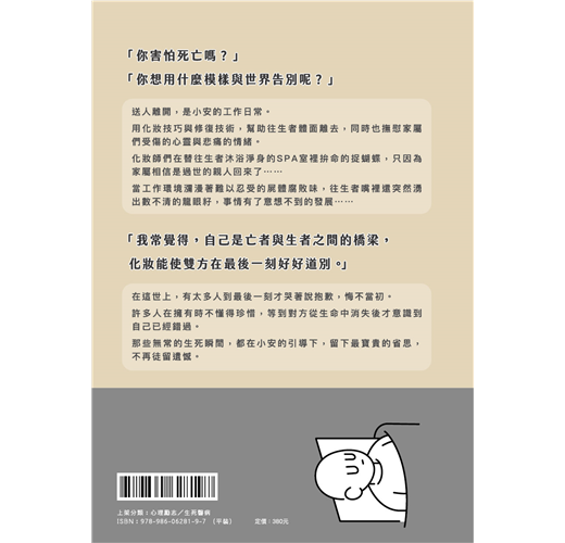 ◆ 「化妝,源自於世人對美的追求;化妝,還原了亡者生命精神的回溯。每一個生命歷練,透過化妝師的手,深化追憶感念並永存意識。每一篇個案連結,透過李安琪的心,不只紀錄生命的句點,更是流傳生命價值的扉頁與省思。」