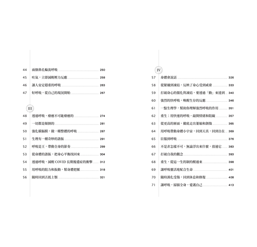 * 豐富的呼吸練習,方便讀者依據自己的身心狀態選用。