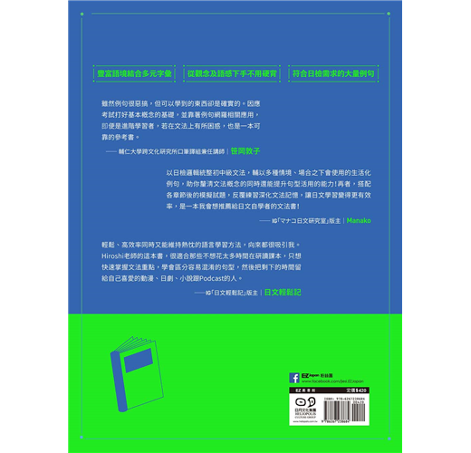 輕鬆、高效率同時又能維持熱忱的語言學習方法,向來都很吸引我。Hiroshi老師的這本書,很適合那些不想花太多時間在研讀課本,只想快速掌握文法重點,學會區分容易混淆的句型,然後把剩下的時間留給自己喜愛的動漫、日劇、小說跟Podcast的人。