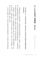 老天,現在沒辦法再睡了。我伸手到背包裡找書,同時小心翼翼不弄亂毯子。找到了,是《沉思錄》(Meditations),薄薄一本,不到一百五十頁,而且頁面的邊界很大。書衣是一位騎在馬上的男子浮雕像,他肌肉強勁、留著落腮鬍,眼神帶著無需證明的沉靜力量。