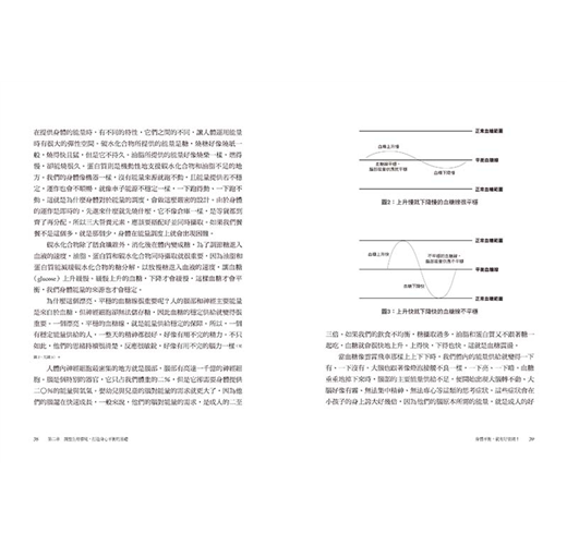 例如我們早餐吃的是一碗燕麥加水果,燕麥和水果進入體內大部分是消化成糖,這時若沒有油脂和蛋白質讓糖的分解減緩,那麼血糖就會升得很快。由於血糖上升得太快,胰臟無法判斷有多少糖進入血液,因此用來降低血糖的胰島素就會釋放過量。過量的胰島素就把血糖壓得超過平衡線往谷底掉。由於血糖掉得又急又快,所以腎上腺釋放壓力荷爾蒙時,也又急又快,量就跟著多,這樣才能適時把血糖提升起來。