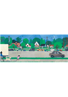 場境設於一個寧靜舒適的社區,湛藍的天空,青鬱的樹木,平整的街道,屋子各有個性,但都給人乖乖的感覺。乖的好感,大概來自繪者乾淨的畫風。色彩溫暖濃厚,構圖平面且平衡,整齊卻不失活潑可愛,是讓人一看便平心靜氣的畫面。