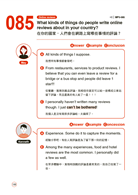書中收錄各種口語常見句型,例如before you know it(沒有意識到;很快地)、I am a foodie person(我是美食愛好者)、with all due respect(恕我直言)、This is just me talking, but I...(這只是我個人意見,不過…)、… is something one can relate to.(…是某人能感同身受的)等等,學會這些口語常見說法,讓你的回答聽起來更自然。