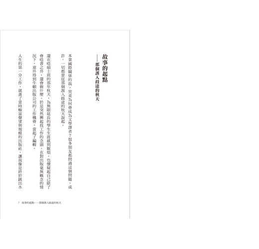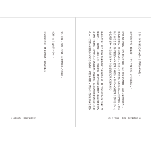 後來的某日,從未在我生活裡缺席的文學再度以另一種方式回到我的生命裡,某種程度上,也改變了我的人生。因著翻譯,職場上的長官發現了我在本職專業之外的另一項潛能,開啟了工作的新階段;因著翻譯,我在高速運轉的沉重工作壓力下,找到了逃脫現實世界的避風港;也因著翻譯,我能在文字所構築的殿堂裡,沉澱、思索,反芻,走過幽暗的人生低谷。
