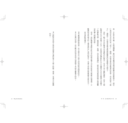 本書像是一本「正念」食譜,搭配著原理的解說,以及各種正念練習的變化。像是美味的佳餚一樣,也許食材不出那幾樣,但透過不同廚師的巧手,卻能變成看起來很不一樣的美食。