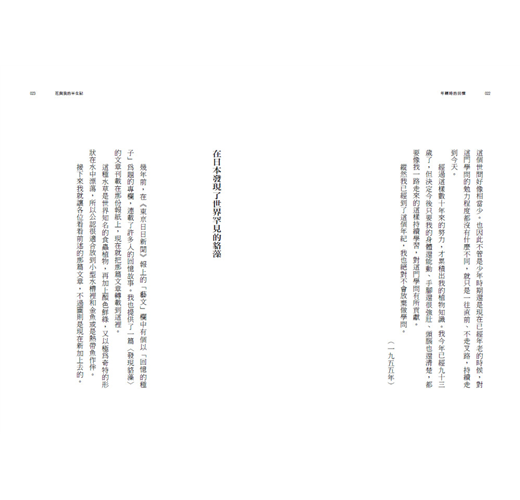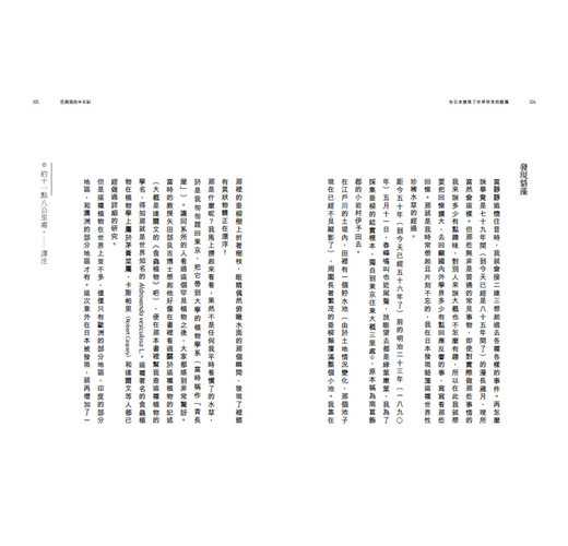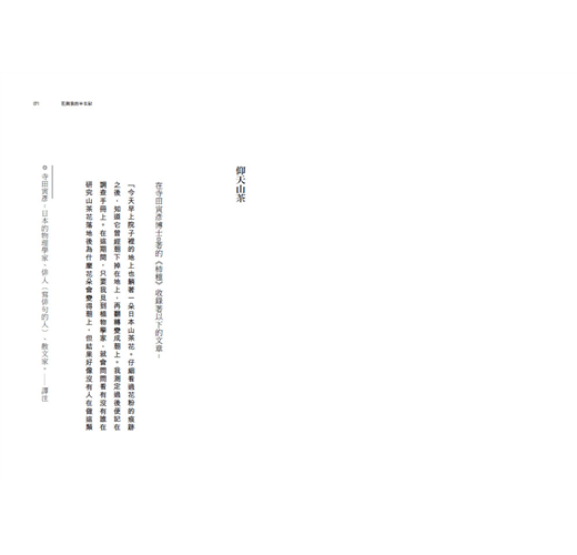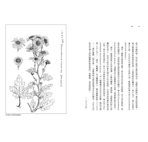 更值得稱許的是,這些文章集中於七十歲以後到鮐背之年的創作。一般書籍導讀一位創作者的書寫意念,往往偏好中壯年或年輕的作品。此時文章的知識盡現澎湃豪情,常見滔滔宏觀之論述。然而牧野早年忘情於植物標本的分類研究、鑑定和插圖,若有出版則多為圖鑑指南和實用的研究著述,幾少散文的書寫。本書選定這些晚年所著的文章,或隱隱約約認同,植物研究者更需要長時的鑽研,以其一生喜愛植物的情感和見識,採用人人易懂的語言,跟我們溫柔敦厚地對話。