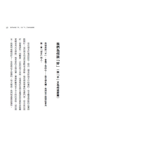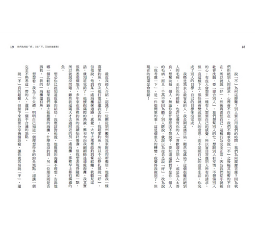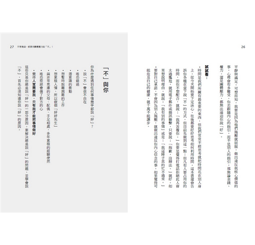 我們從小就被教育不要傷害他人,連說「不」拒絕他人的請求,都開不了口,結果就是按他人的意思安排自己的時間,事後才感到後悔。這本書要教你以各種技巧學會說「不」,即不會讓對方感到不悅,又能把時間留給自己、重要的人,或重要的事。
