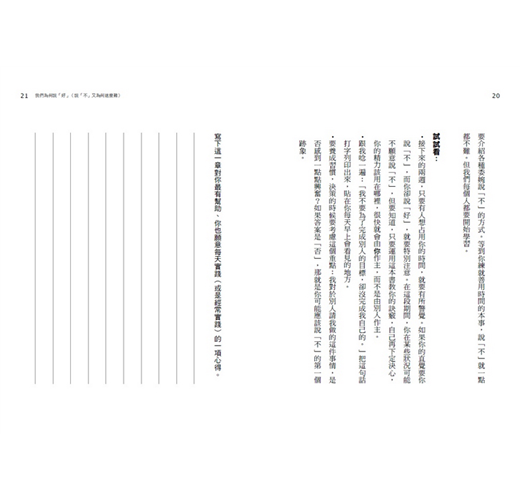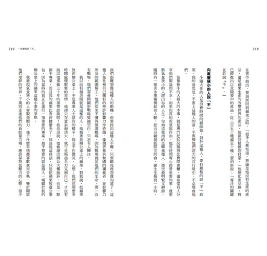 成功人士也是說「不」的高手,他們向不重要的邀約說「不」,把時間留給影響大局的決策思考,他們也擅長於向失敗說「不」,不斷嘗試會成功的方法。