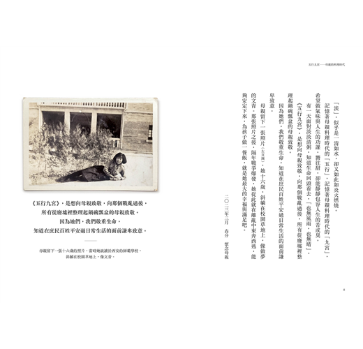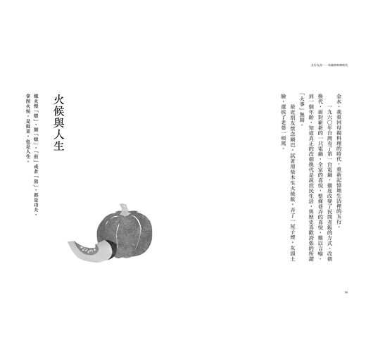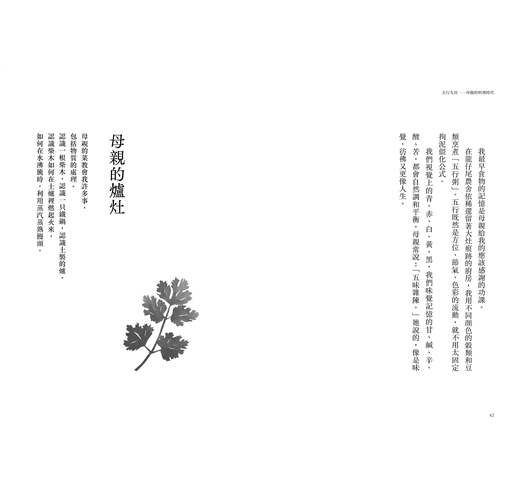 記憶著母親料理時代的「五行」,記憶著母親料理時代的「九宮」,希望做氣味與人生的功課,嚮往甜,卻能靜靜包容人生的苦或臭。