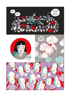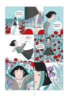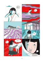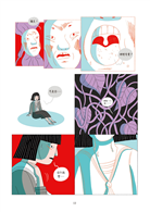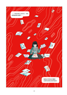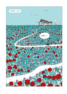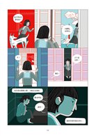 這不是我第一次閱讀草間彌生的傳記,但透過圖像小說的形式,更強烈體會「藝術是她的藥療」這句話的份量。與過去閱讀的印象不同,雖然書裡一樣呈現草間在精神疾病下的掙扎,卻也更聚焦在她如何行銷自己和自己的藝術創作,想在世人面前熠熠發亮的企圖心。作者埃莉薩.馬切拉里用了幾個連續頁面展現草間這種積極「攻頂」的野心,相較於純文字書更能讓讀者感受到她的渴望。清冷的藍綠色和熾熱的鮮紅色組成本書的主色調,既大膽衝突,卻也意外地協調得當,彷彿就像草間在這個世界的存在以及她的各種影響一樣。——藍依勤(繪本星球212-7版主)