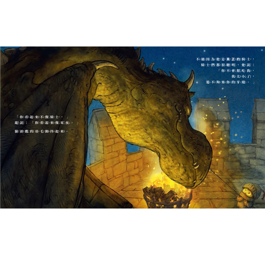這個作者和家人一起晚餐吃比薩時構想的故事,不僅文字有輕快風趣的敘事節奏,每頁細緻豐富的插畫處處是驚喜,在中古世紀的騎士宇宙中藏著巧妙可愛的現代幽默。從正在準備老鼠晚餐的貓頭鷹媽媽和邊看報邊翻白眼的貓頭鷹爸爸,到小貓頭鷹直挺腰桿,穿著盔甲微凸的小肚子認真盡職的守護城堡,竟然喜歡吃比薩的巨龍和他的孩子們圍著營火與他的貓頭鷹朋友一起守夜,每頁都令人著迷,是大人和孩子讀了都能會心一笑的「冒險勵志」故事啊!