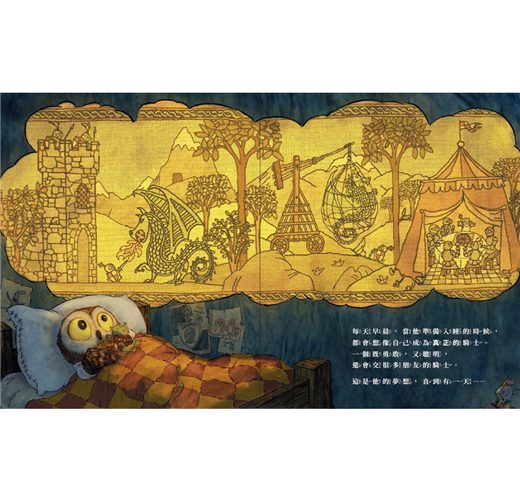 沒有騎士該具備的強健體格,而且天生晝伏夜出,貓頭鷹走的是一條與眾不同的築夢之路。因為越夜精神越好,他可以值夜班守城,因為無法舉劍迎戰飛龍,他運用聰明機智,打消餓龍吞下他充飢的念頭,因此化解了騎士與龍的敵對關係,解除了騎士漸漸消失的危機。不需要揮劍被甲,貓頭鷹也成為了一個既勇敢又聰明,還會交很多朋友的騎士。