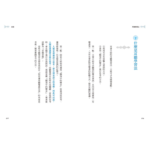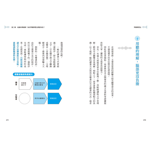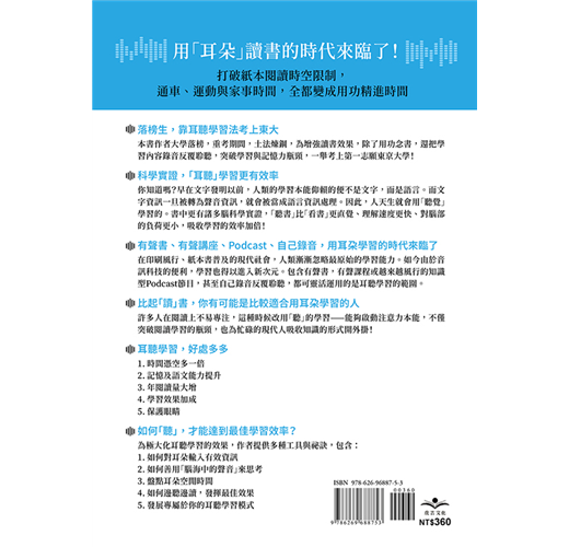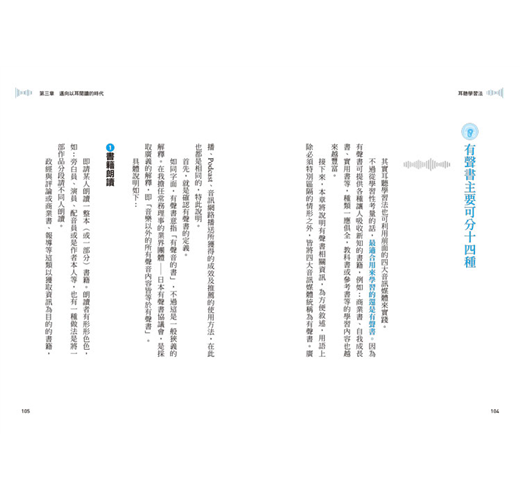 包含現有有聲書,或越來越風行的知識型Podcast節目,甚至如同作者經驗,為了準備考試,自己錄音反覆聆聽,都可靈活運用的是耳聽學習的範圍。