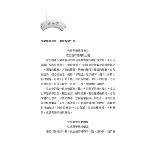 生命中的每一件事情都有其緣由,失敗不是意外發生,成功也不是偶然出現。觀念是因,績效是果。要改變最後結局,必先改變內心想法;只要您願意,您就能掌握自己的想法。成功之樹要想枝葉繁茂,必先正本清源;只要透澈貫通行銷觀念,務實應對行銷做法,將會改變您一生的命運,使您收穫滿滿、名利雙收,並且充滿成長與喜悅。