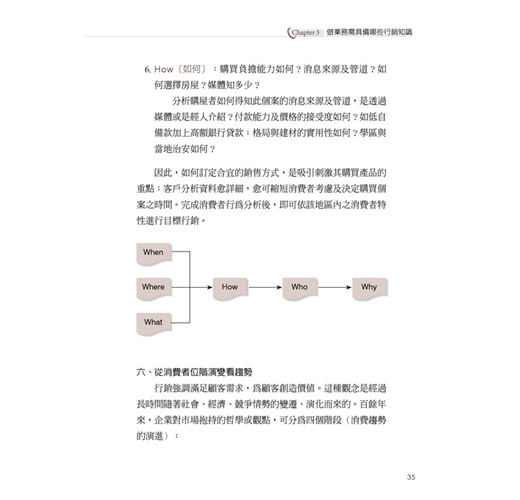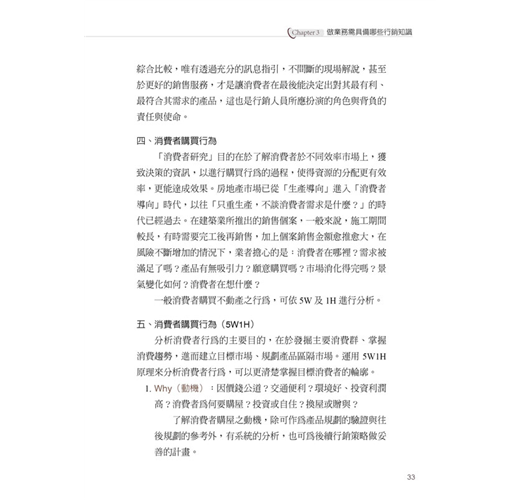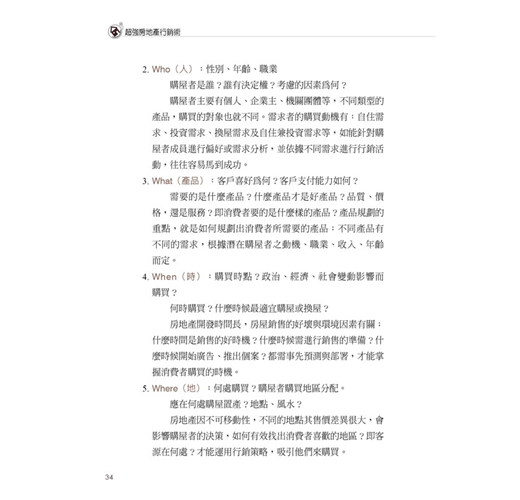 1. Why(動機):因價錢公道?交通便利?環境好、投資利潤高?消費者為何要購屋?投資或自住?換屋或贈與?了解消費者購屋之動機,除可作為產品規劃的驗證與往後規劃的參考外,有系統的分析,也可為後續行銷策略做妥善的計畫。
