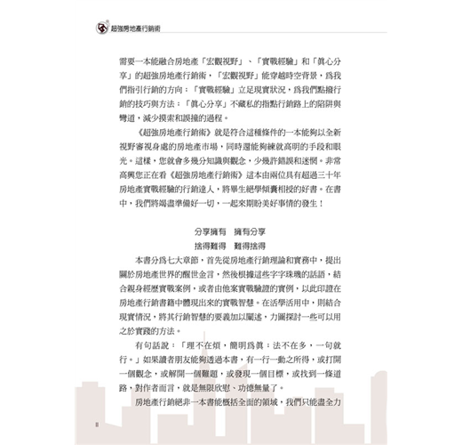 想要行銷得好一點,就必須要懂得多一點。這時候,我們就需要一本能融合房地產「宏觀視野」、「實戰經驗」和「真心分享」的超強房地產行銷術,「宏觀視野」能穿越時空背景,為我們指引行銷的方向;「實戰經驗」立足現實狀況,為我們點撥行銷的技巧與方法;「真心分享」不藏私的指點行銷路上的陷阱與彎道,減少摸索和誤撞的過程。