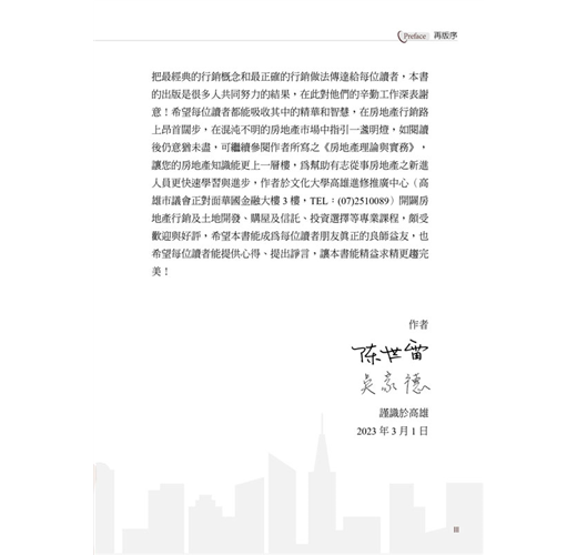 房地產行銷絕非一本書能概括全面的領域,我們只能盡全力把最經典的行銷概念和最正確的行銷做法傳達給每位讀者,本書的出版是很多人共同努力的結果,在此對他們的辛勤工作深表謝意!希望每位讀者都能吸收其中的精華和智慧,在房地產行銷路上昂首闊步,在混沌不明的房地產市場中指引一盞明燈,如閱讀後仍意猶未盡,可繼續參閱作者所寫之《房地產理論與實務》,讓您的房地產知識能更上一層樓,為幫助有志從事房地產之新進人員更快速學習與進步,作者於文化大學高雄進修推廣中心(高雄市議會正對面華國金融大樓3樓,TEL:(07)2510089)開闢房地產行銷及土地開發、購屋及信託、投資選擇等專業課程,頗受歡迎與好評,希望本書能成為每位讀者朋友真正的良師益友,也希望每位讀者能提供心得、提出諍言,讓本書能精益求精更趨完美!
