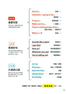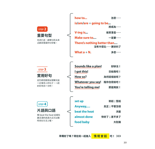「重點單字」會特別標出教育部頒定的國中小基礎1200字、常用800字與課外單字,課外單字可以瀏覽過去,但基礎與常用單字最好先背下來,這些都是國中必考的單字。而會話中所教到的「句型」包含了國中會遇到的句型和文法概念,能先了解也會有很大幫助。「片語」的範圍也多落在國中範疇,它們也是英語學習中的重要部分。會話中出現的「實用短句」,短句長度不長,但非常實用,在日常生活中很容易運用出來,很建議背起來加強口語表達。而「口語」則類似片語,但是口頭上的、非正式的短詞,在實際的英語會話中很常出現,若想要口說更自然、更道地,就可以學起來。