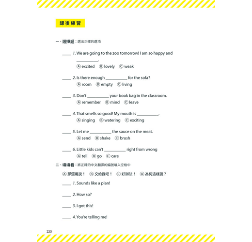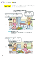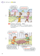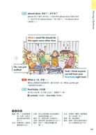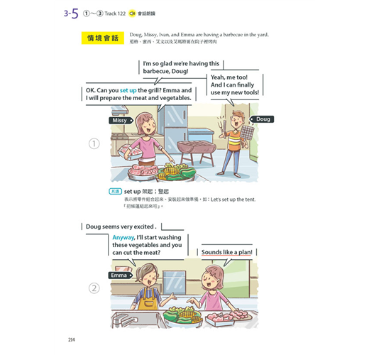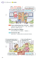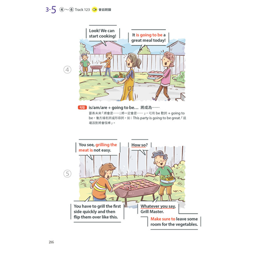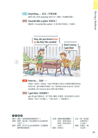 本書共分為四大主題,共30個單元,每個單元都是有趣又常見的生活情境,幾篇內容合乎108課綱的核心素養,讓孩子不僅學英語也能學到其他領域的相關知識。另外,每個單元的規畫都是依循著三步驟:「課前準備」、「情境會話」、「課後練習」。「課前準備」是把會話裡將學到的單字、句型等等先以重點整理的方式列出。若能先把單字記熟,片語的中文先瀏覽過,對於會話的閱讀就比較不會有障礙。接下來是進入「情境會話」,每篇會話都有9張場景圖來帶出主角的話語,最後是「課後練習」,除了考重點單字、片語、短句,還另外有聽力練習。此聽力練習約略模仿劍橋兒童英檢flyer等級的三大聽力題模式,幫助孩子訓練聽力。