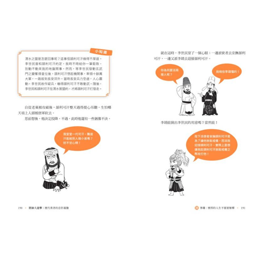 營造輕鬆現代化語境,讓讀者在歡笑中進入情境,深入淺出,重要事件過目不忘。各年齡層讀者都爭相閱讀,激發孩子對歷史人物的興趣,從而愛上歷史;讓家長換個視角,用幽默口吻向孩子講述歷史故事,打破對歷史的刻板印象。提供更多課本上沒告訴你的歷史冷知識,關鍵情節特別加上「小知識」方塊串聯、釋疑,更能理解歷史發展的來龍去脈。