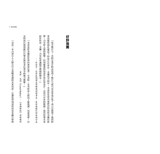 「本書是對金融新世界的重要反思。布萊特.史考特深入探討了區塊鏈、加密貨幣,以及科技巨頭和銀行巨擘在無現金社會中的權力聯繫。」──萊諾.巴伯(Lionel Barber),《金融時報》前總編輯