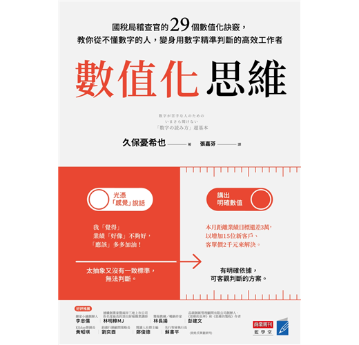 所以,別再說自己對數字不靈光、我的強項是文科了!透過這本書, 你也可以重拾對數字的信心,並且透過生活與工作的實踐,培養數值化思維的自信。