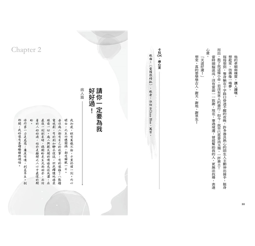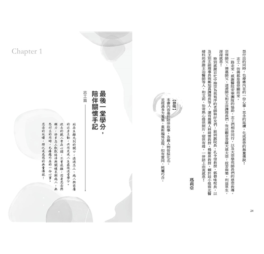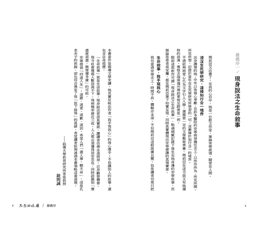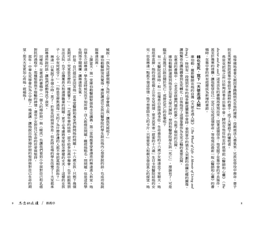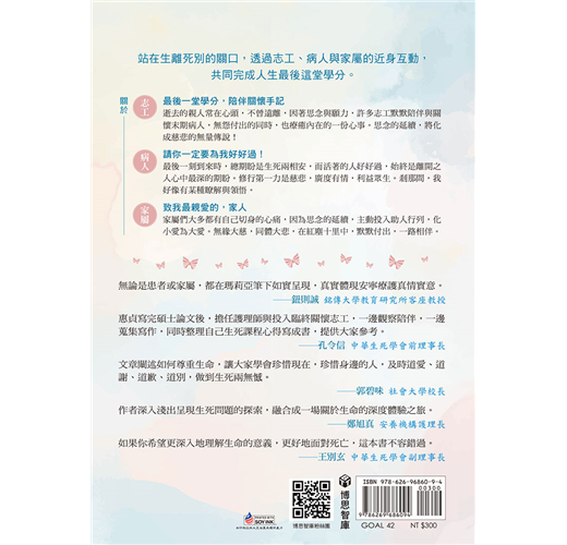 ▲轉化生死,寫下「天使走過人間」 庫伯勒.羅斯醫師在她的自傳《天使走過人間》(The Wheel of Life: A Memoir of Living and Dying),特別有一段提到早年的她參觀波蘭集中營時,看到營中的猶太人刻劃的由繭化蝶的圖像,讓她驚奇也讓她體會到生死轉化,日後她用了這個象徵作為生死之輪的重要比擬。 在惠貞的書稿中,〈老北京祥獅門環的故夢〉也做了類似的比擬。 庫伯勒醫師還提到她在芝加哥大學代課時,想到和醫學院學生談「死亡」,理論有了,可是臨床上有誰可以說出關於死亡,或接近死亡的故事呢? 有一天醫院巡房時,和一位罹患白血球過多症,生命垂危的十六歲少女琳達坐下來聊天。她很坦率直接,她的母親在報上公布女兒病情,要求民眾寄「甜蜜的十六歲」生日卡到醫院給她的女兒,但是琳達一點都不領這份情。她不想要陌生人的卡片,只想要家人和親友發自真心的探望,她喊說:「我為何這麼倒楣?為何上帝會挑上我,讓我死掉呢?」 庫伯勒醫師突然覺得,應該讓這位女孩向醫學院的學生說出她內心想要說的話,也成功地說服琳達出席。 上課當天,第一堂庫伯勒醫師緊張地念完講義,第二堂她推著穿著漂亮的琳達進入教室。她向學生介紹琳達,學生這時候反而不知所措,沒人敢提出問題,雖經她點名、問問題,但是這些學生問得不關痛癢,讓琳達很生氣。 於是,自己提出並回答她一直希望醫師和專家們詢問她的問題:「十六歲女孩,只剩下幾個星期可活,究竟是怎麼的一種感覺?」、「花樣年華的姑娘,卻不能參加高中舞會,也不能跟男朋友出去玩,也不必擔憂長大和選擇職業的問題,更不必考慮將來嫁給怎麼樣的丈夫――這樣的女孩子,心中有何感受?」、「妳是怎麼熬過每一天的?為什麼身邊的人都不肯把真相告訴妳?」 琳達一口氣說了半個小時,累了,於是先回病房休息,但此時在場的學生改變了!大家都承認琳達所說的話,讓他們感動得流下淚來。 同樣地,在惠貞的書稿中〈一個人的婚紗照〉與〈暖流〉也讓我們看到小宇面對自己和乳癌對抗的過程中,那種堅毅與不服輸的神情,還有少女對自己生命的珍愛與堅持。 那年,中華生死學會也為小宇辦了一場演講,讓她說出她對婚紗照的堅持與對自己生命的期望。那天大家更加心疼她、祝福她! 惠貞的書稿也寫出了她自己的生死經歷,完成碩士論文之後、擔任護理師與投入臨終關懷的志工,一邊觀察陪伴,一邊蒐集寫作,不但完成這本新作,更重要的還是整理了自己的生死課程心得,提供給大家參考。相信她還會繼續完成更多「天使走過人間」的生命故事!