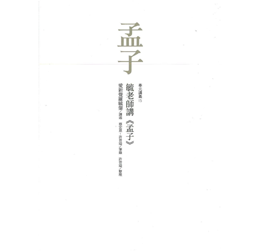 一九九五年五月,老師分七次挑選講述《孟子》,即使未能遍說全書,兩位學長已相當完整地記錄老師當時所述的內容,而且此次講課可能是老師在教學晚期較完整講述《孟子》的一次。既然如此,是否有方法彌補研讀時的缺憾?筆者略陳管見,謹供讀者參酌。其一,先瞭解毓老師提示的《孟子》要點(見本書第一頁),而後仔細研讀毓老師講述的所有內容。其二,毓老師每次講授《孟子》前,必先要求學生在不同的章句前,以圓圈標示其重要性(一至三圈),圈數愈多愈重要;讀者可參考本書所做標示,於研讀《孟子》時順著篇次先讀圈數多的章句,次及圈數少者,進一步玩味體會毓老師所述要點、精選章句所欲傳達的《孟子》要義。