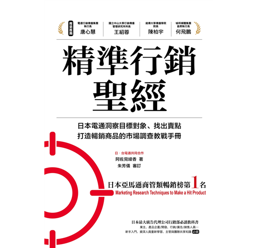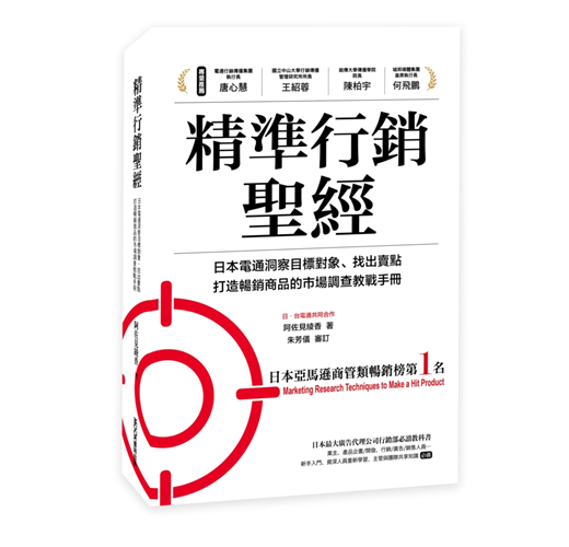 要找出關鍵洞察,得進行全面的市場研究,其中一項重要的研究方法,就是市場調查。這是一門博大精深的學問,涉及各種類型和技巧,日本電通成立至今122年,作為歷史最悠久的行銷傳播集團之一,經過時間和經驗的淬鍊,已發展出一套獨門心法,而本書作者身為策略規劃師,當然是箇中翹楚。本書詳細解說了不同型態的市調應用,有系統地梳理常見的盲點和克服障礙的明確做法;在此特別感謝台灣電通集團的策略與諮詢副總經理Julia(朱芳儀),以她曾在日本電通工作的角度切入,責無旁貸完成中文版的監修校閱工作,幫助中文讀者領略市場調查的精髓,學習日本專家的情報力與擅長細節微觀的洞察,更有效率地達到行銷目標。
