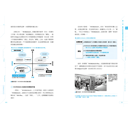 2018 年,「WORKMAN」決定將客群從購買工作服的工匠師傅擴大至一般客人。那麼該對一般客人打出哪些「賣點」,才能讓商品熱賣呢?「WORKMAN」先以昂貴、便宜這兩個價格軸,以及機能性這個軸,將一般客人的服飾市場分成 4 個象限(參考下頁圖)。如此分類之後,便發現兼顧「平價」與「高機能性」的象限是沒有競爭品牌,未經開發的處女地。