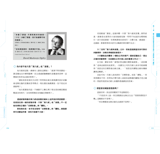 在直覺敏銳、充滿感性的創意人員的世界裡,「調查」被如此重視或許會讓人覺得意外,就連奧格威也曾指出,許多創意部門的人「對調查這件事很感冒」,也曾說「連偉大的威廉.伯恩巴克,也與其他眾多廣告人一樣,覺得調查會妨礙創意發展」。