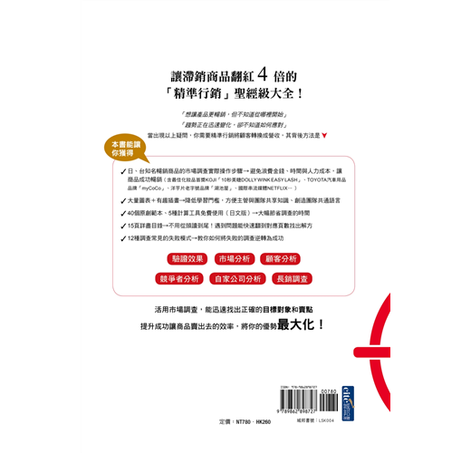 ☉日、台知名暢銷商品的市場調查實際操作步驟,加速你找到正確的「目標對象」與「賣點」,避免浪費金錢、時間與人力成本,讓商品成功暢銷。