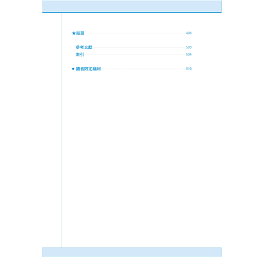 ☉15頁詳盡目錄、近300條索引,讓你不用從頭讀到尾!遇到問題能快速翻到對應頁數找出解方。