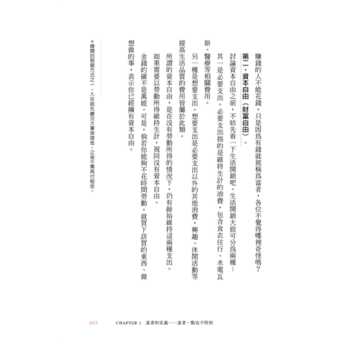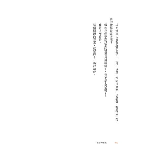 這裡說的富者,不包括媒體炒作的名人或藝人,因為他們缺乏時間或人際自由。正如我在第一章下的定義,富者是擁有三種自由的人。因此,儘管收入再高,缺乏時間或人際自由的名人或...