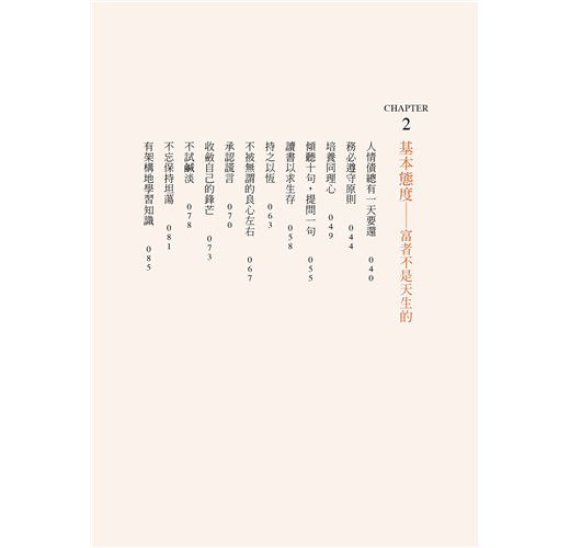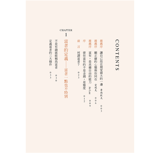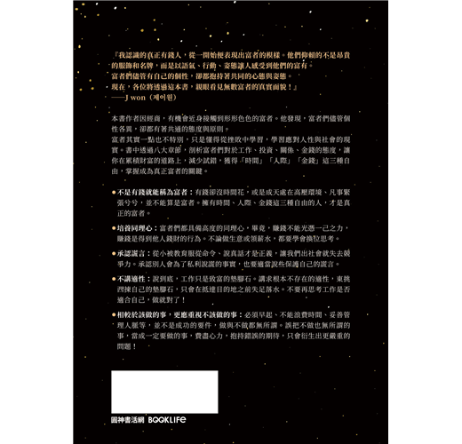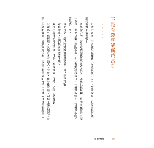 本書作者因經商,有機會近身接觸到形形色色的富者。他發現,富者們儘管個性各異,卻都有著共通的態度與原則。