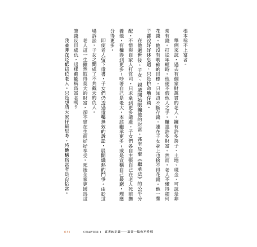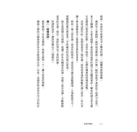 有錢卻沒時間花,或是成天處在高壓環境、凡事緊張兮兮,並不能算是富者。擁有時間、人際、金錢這三種自由的人,才是真正的富者。