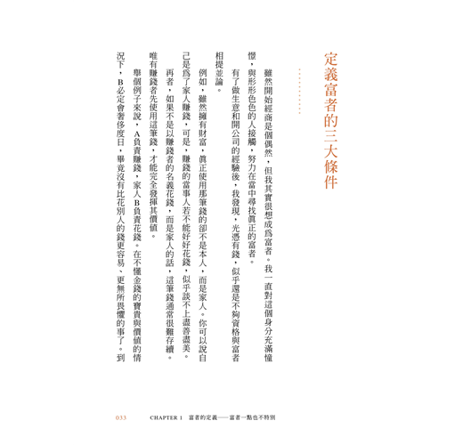 這裡說的富者,不包括媒體炒作的名人或藝人,因為他們缺乏時間或人際自由。正如我在第一章下的定義,富者是擁有三種自由的人。因此,儘管收入再高,缺乏時間或人際自由的名人或藝人,仍難以稱得上富者。