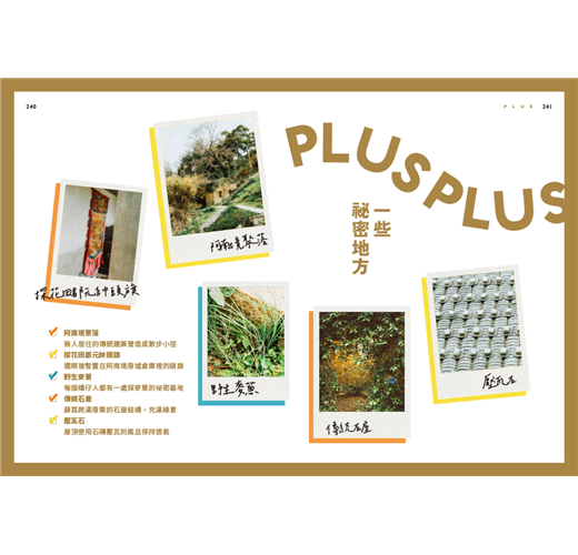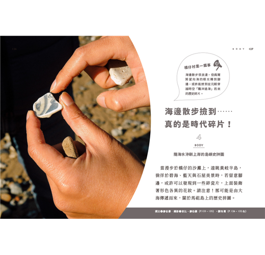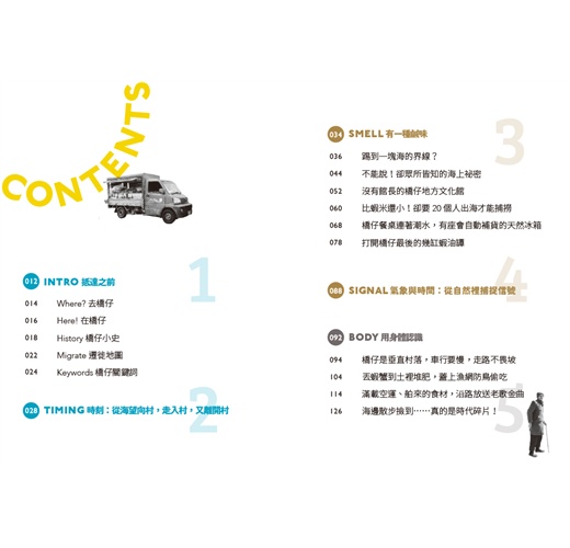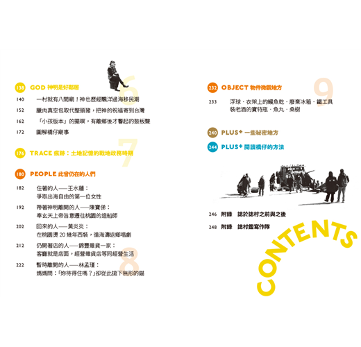 本書由「INTRO 抵達之前」出發,終於「OBJECT 物件微觀地方」,概論地方的空間到時間,從土地到其上的人,並以物解鎖尋常眼光。攝影圖輯的安排,定格村里的時刻,也定焦過往戰地政務,在海灘上留下的痕跡。