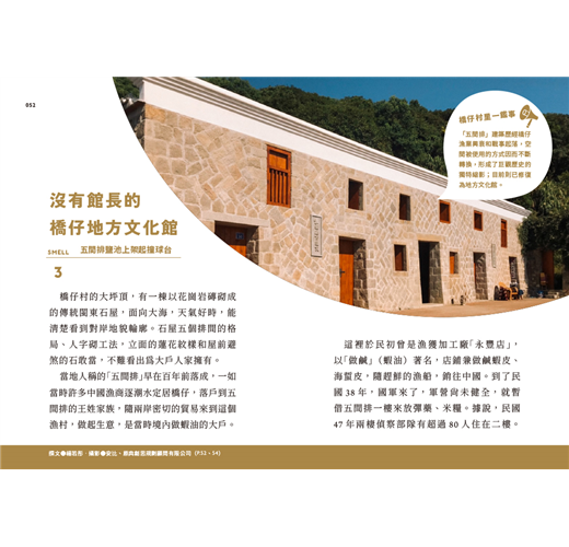 「SMELL有一種鹹味」談橋仔與海為田的獨特生活面貌,還有其因為鄰近中國,而有的那個「不能說的海上祕密」……「BODY用身體認識」則從橋仔「垂直村落」的地形特色切入,是什麼原因讓在地耆老即便換過人工關節,仍不厭其煩於村內移動?「GOD神明是好鄰居」所言不假,一眼可望盡的小小橋仔村竟然就有八間廟,還曾有過「神比人多」的時期。