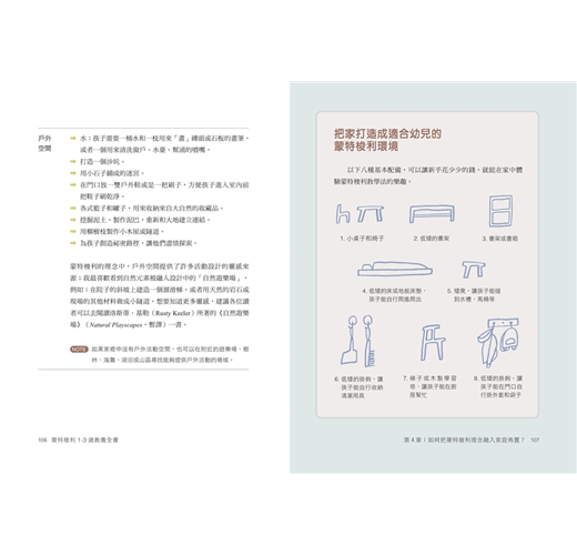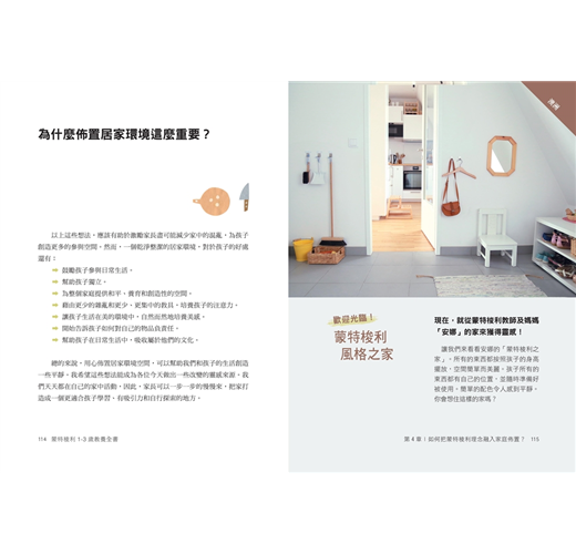 2. 教你從0開始打造蒙特梭利之家,包含客廳、廚房、臥室、浴室、書房等的蒙特梭利式空間佈置訣竅。