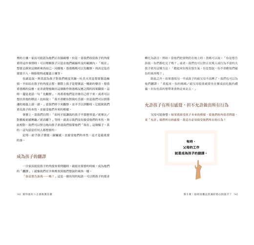 4. 本書內容詳盡,從「孩子不配合怎麼辦?」到「如何跟孩子的其他照顧者(如祖父母)溝通」,囊括各式育兒情境和狀況。