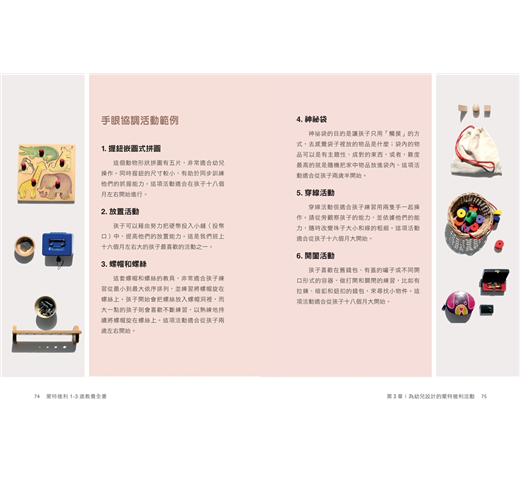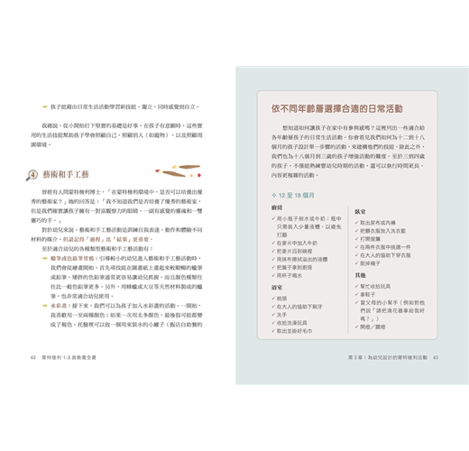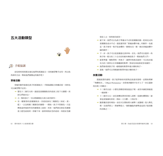 【本書特色】1. 本書針對1-3歲的孩子,提供最實用的蒙特梭利活動提案、具體步驟和日常實踐點子。