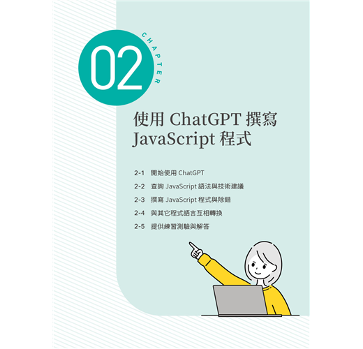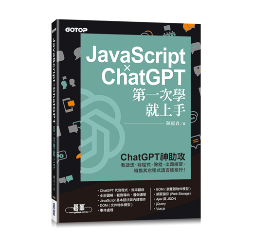 在本書中,我們除了告訴您如何使用ChatGPT撰寫程式、解讀程式、查詢語法、尋求技術支援、除錯、出題練習、在JavaScript與其它程式語言之間做轉換,更重要的是有計畫地帶您學習JavaScript,無論您有無程式設計的經驗,只要約略具有HTML與CSS的基礎知識,都能看得懂、學得會,不會愈看愈挫折、半途而廢。