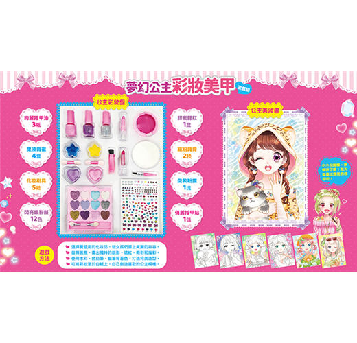 讓你變身為小小化妝師,替女孩們畫出美麗的妝容!本產品包含指甲油、眼影、口紅、脣蜜、腮紅、指甲貼、粉撲、刷具,以及一本公主美妝遊戲書,孩子可利用彩妝品,自由的在遊戲書上替每位女孩化妝,也可利用蠟筆、色鉛筆等,塗上漂亮的髮色及亮麗的服裝。遊戲過程中不僅能發揮創意及想像力,同時可提升專注力並訓練手部小肌肉;完成作品後,也滿足了孩子的好奇心與成就感。所有彩妝品皆可拆下使用,遊戲結束後再裝進家中的小小化妝包,方便攜帶,走到哪玩到哪。