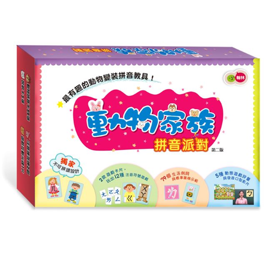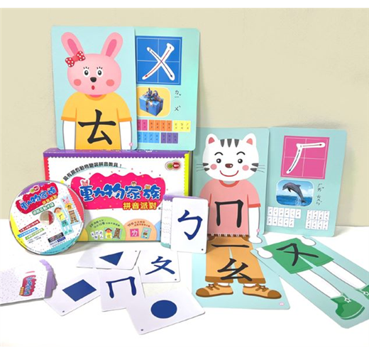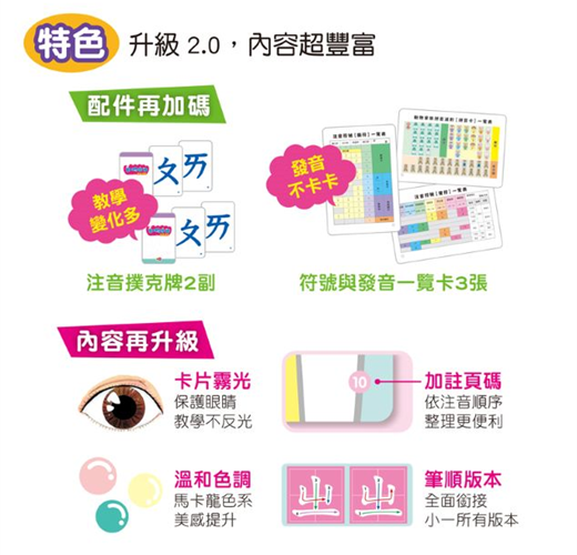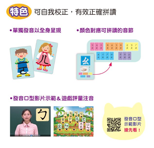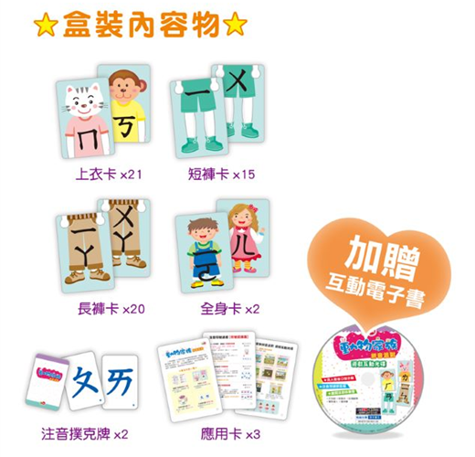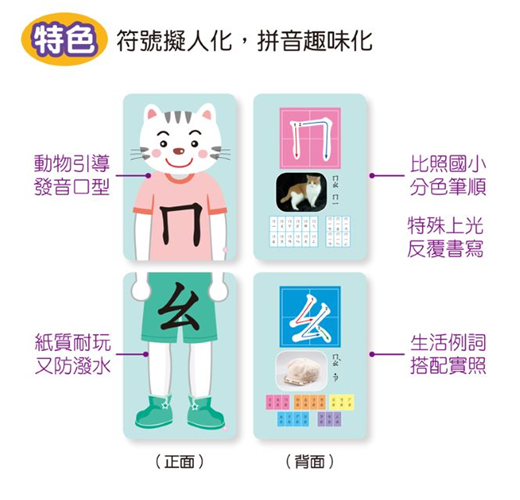 以服裝搭配概念,引領幼兒進行注音符號的拼讀,在遊戲中組合與練習拼音。卡片背面附有實照例詞與拼音表,可進行拼音練習,上光設計,可使用水性筆重複書寫練習。搭贈豐富的電子資源,包含互動遊戲評量光碟,以及真人發音嘴型影片,讓孩子透過遊戲進行拼音複習。